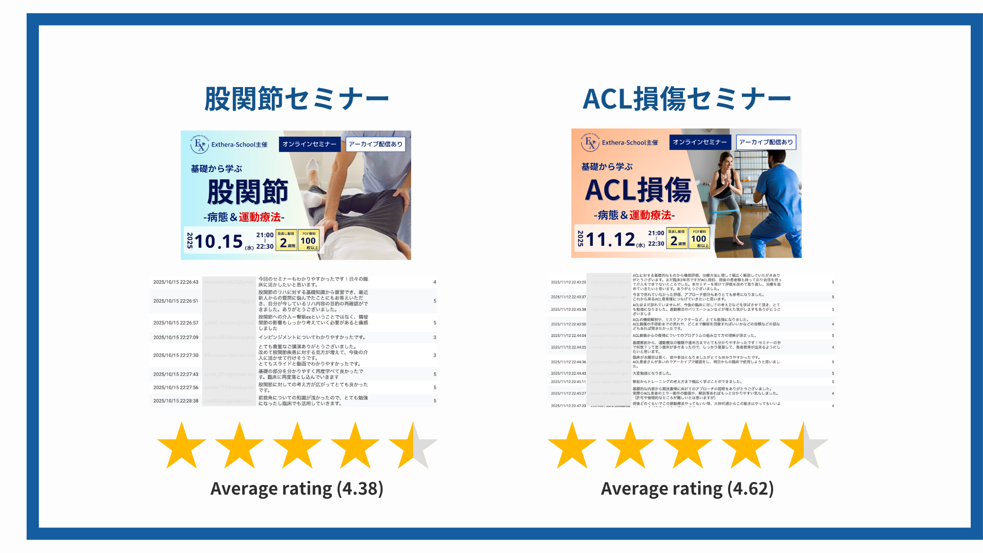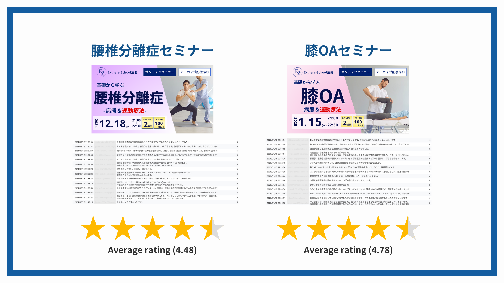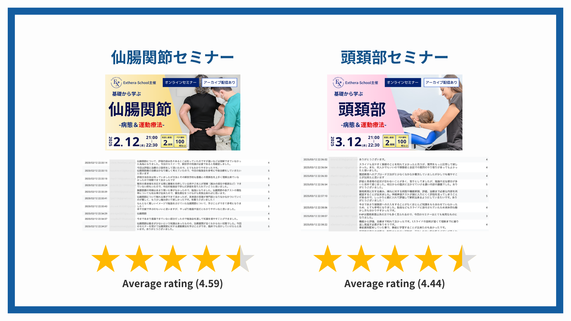 腰椎分離症、膝OA、仙腸関節、頭頸部、腰痛、呼吸、内反捻挫、オスグッド、肩関節、脊柱管狭窄症、股関節、ACL損傷、膝関節 ── すべて平均評価 4.4 以上。
