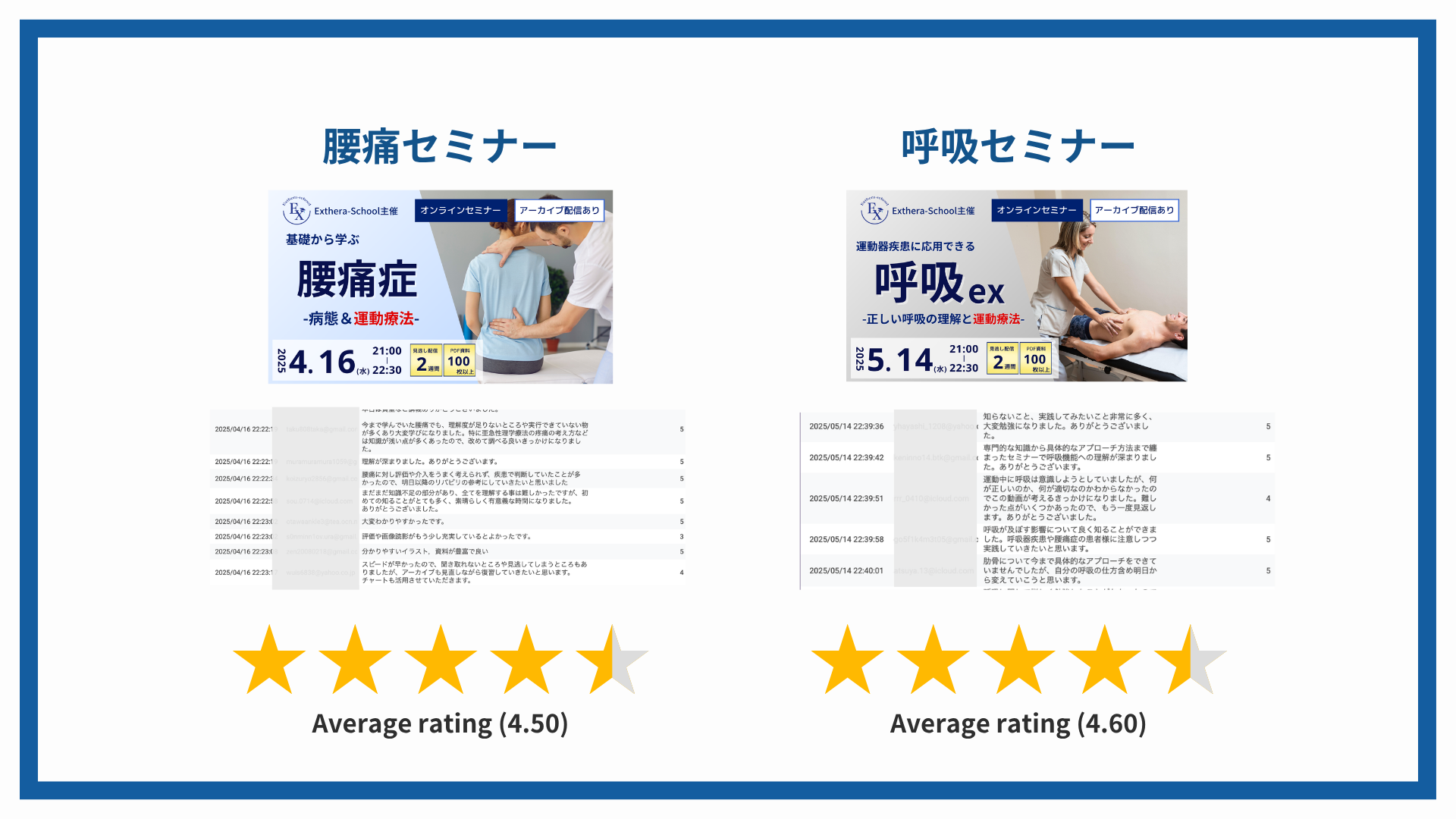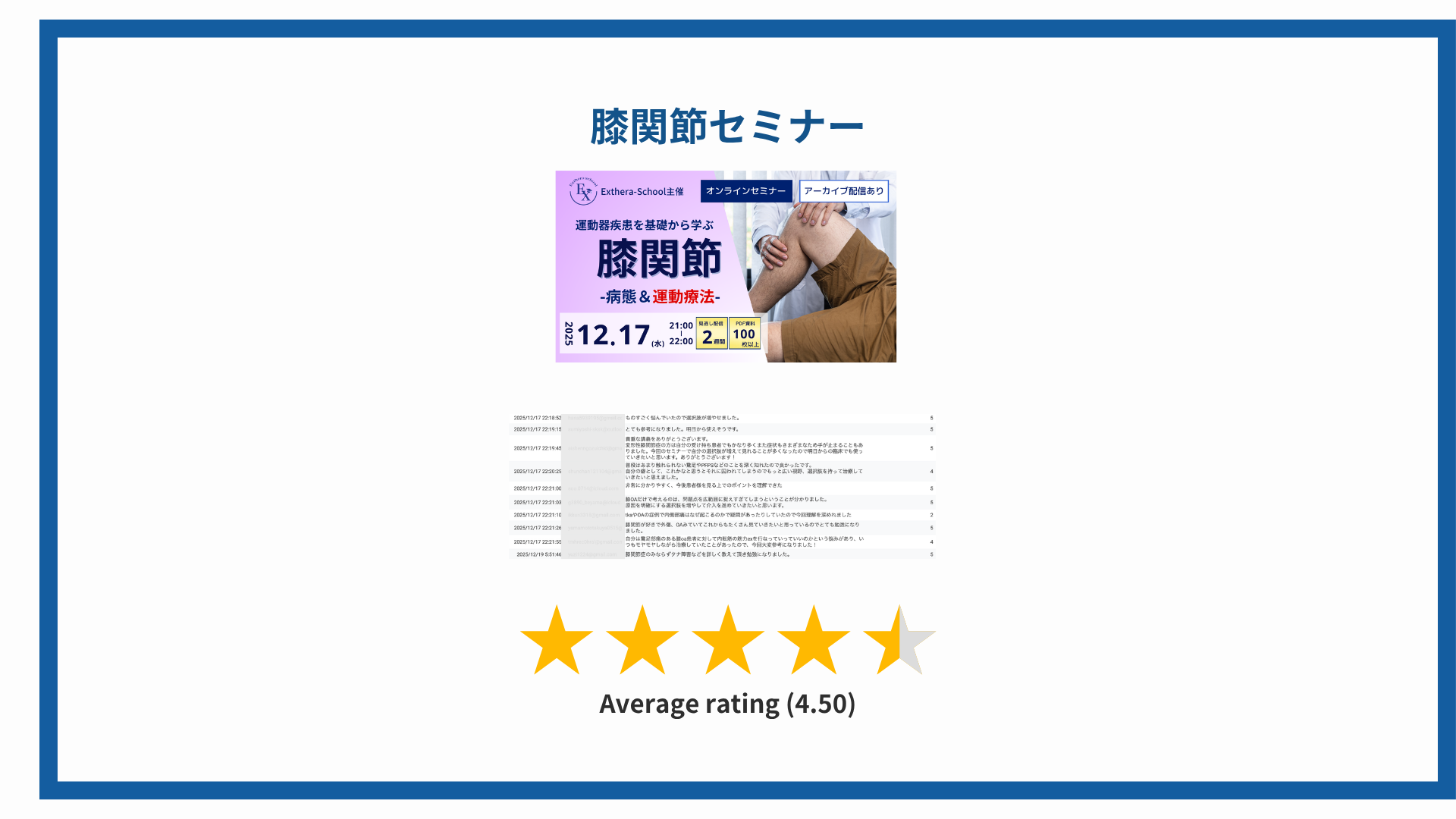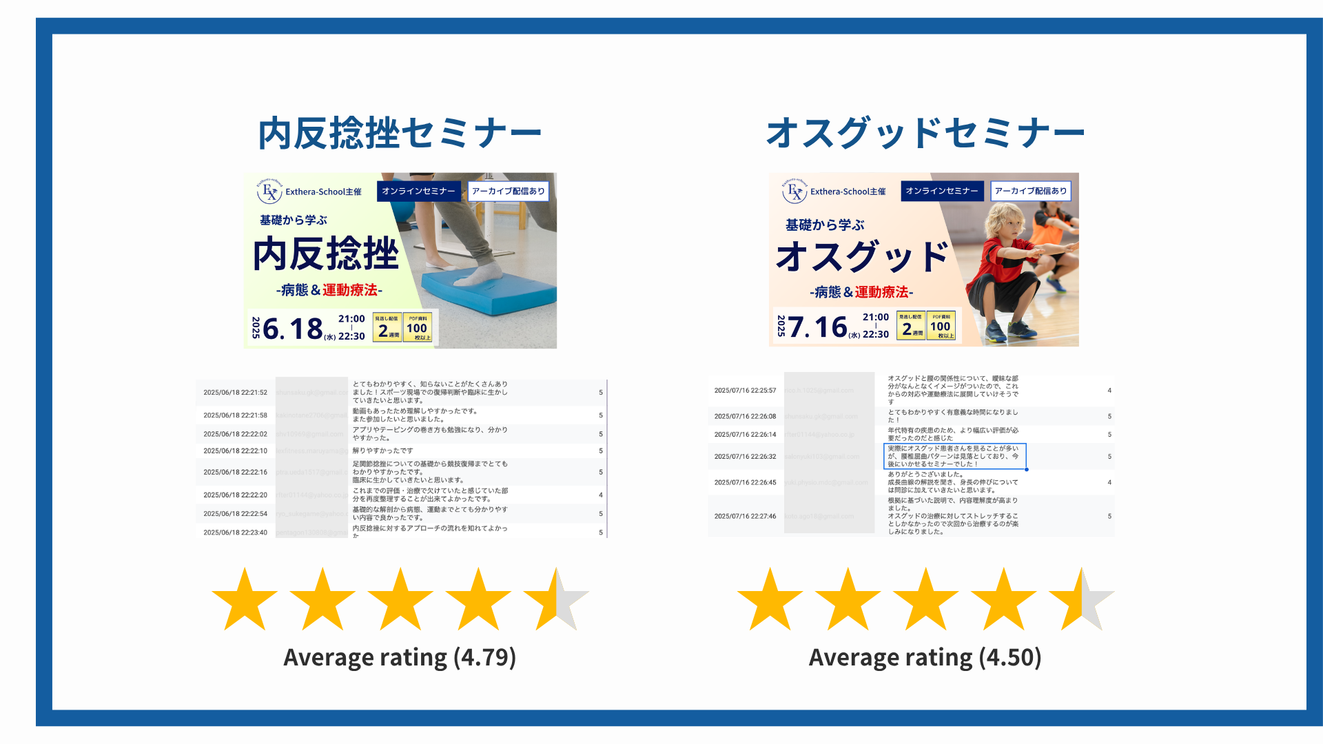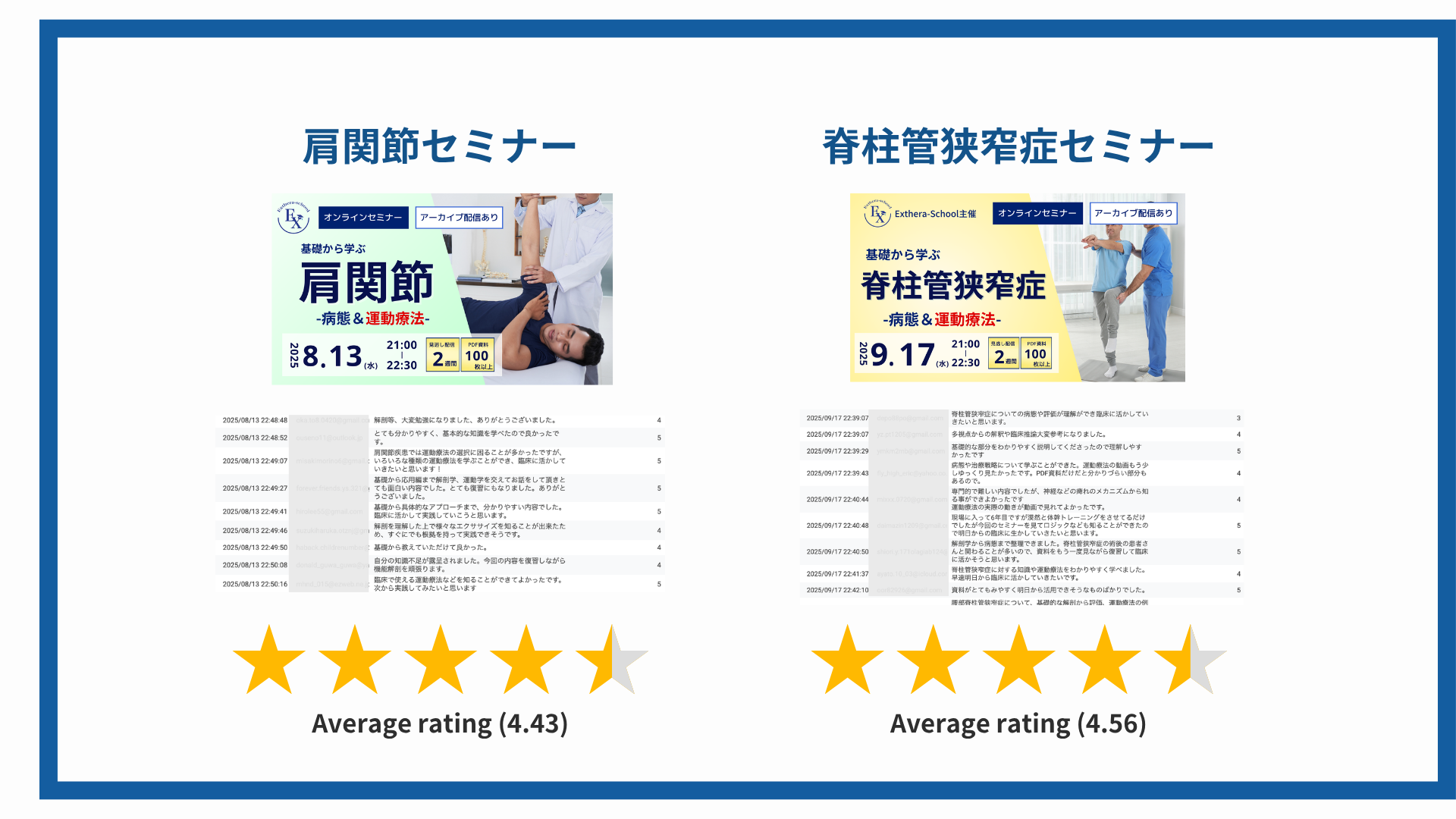 腰椎分離症、膝OA、仙腸関節、頭頸部、腰痛、呼吸、内反捻挫、オスグッド、肩関節、脊柱管狭窄症、股関節、ACL損傷、膝関節 ── すべて平均評価 4.4 以上。